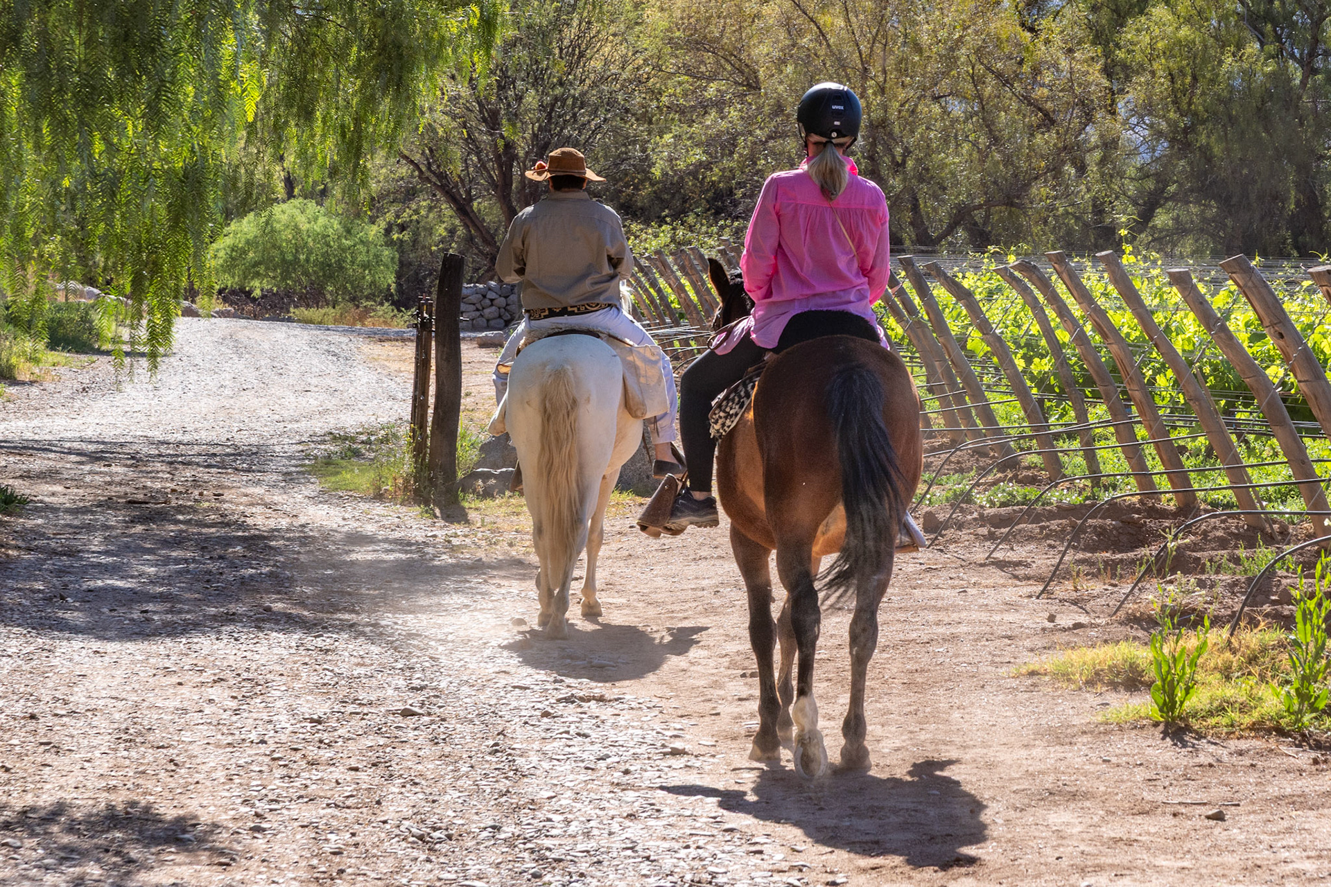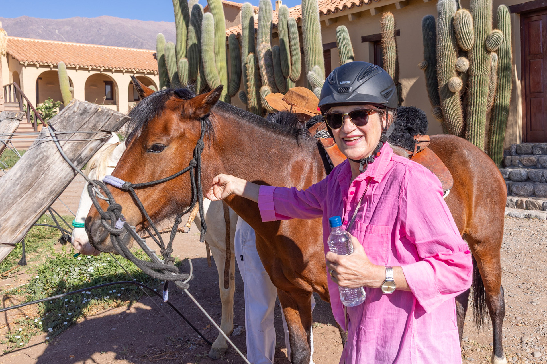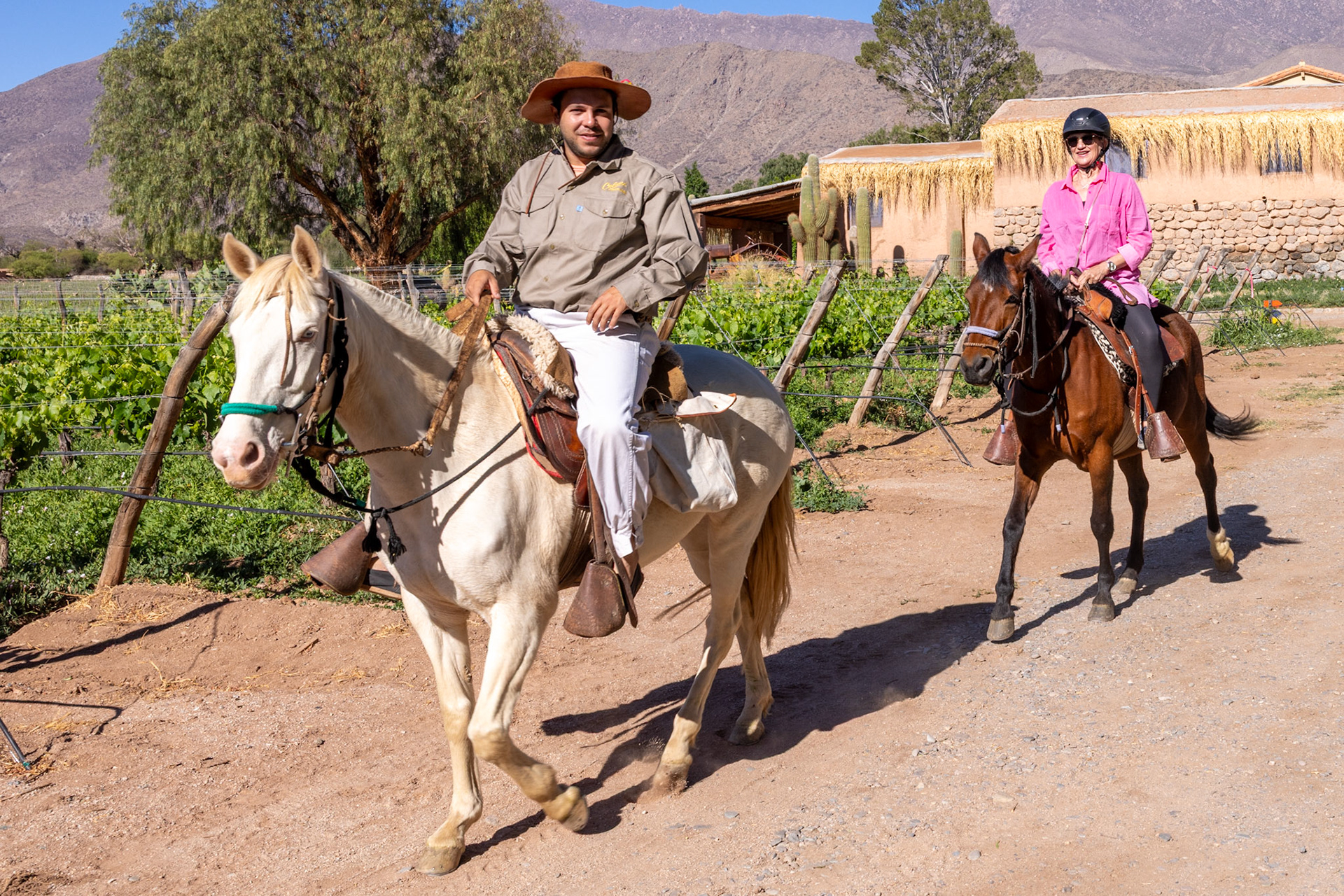 Was für ein wunderbarer Tag. Auf dem Programm steht die Reise von Molinos nach Cafayate. Die Abfahrt verzögert sich noch ein wenig, da Fränzi eine Tour auf dem Pferd durch das Weingut gebucht hat. Ich beschränke mich dabei auf das Fotografieren. Pünktlich um 9 Uhr trifft José mit seinen zwei Pferden, Oma und Elena beim Hotel ein. Er erklärt Fränzi, wie man das Pferd per Zügel bremsen und beschleunigen kann. Nach ein paar weitern Instruktionen reiten die beiden los und ich kann mich dem Packen der Koffer widmen.