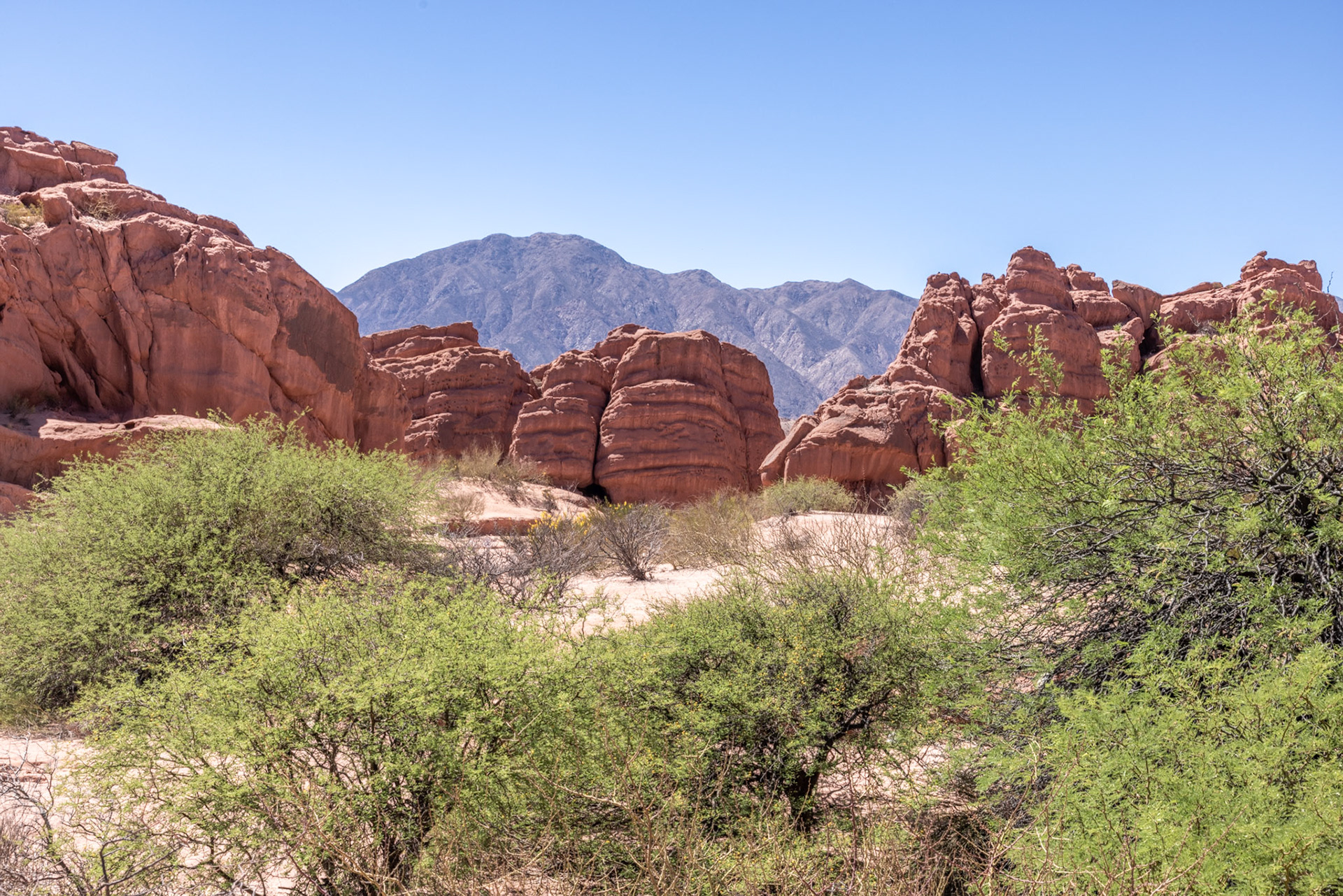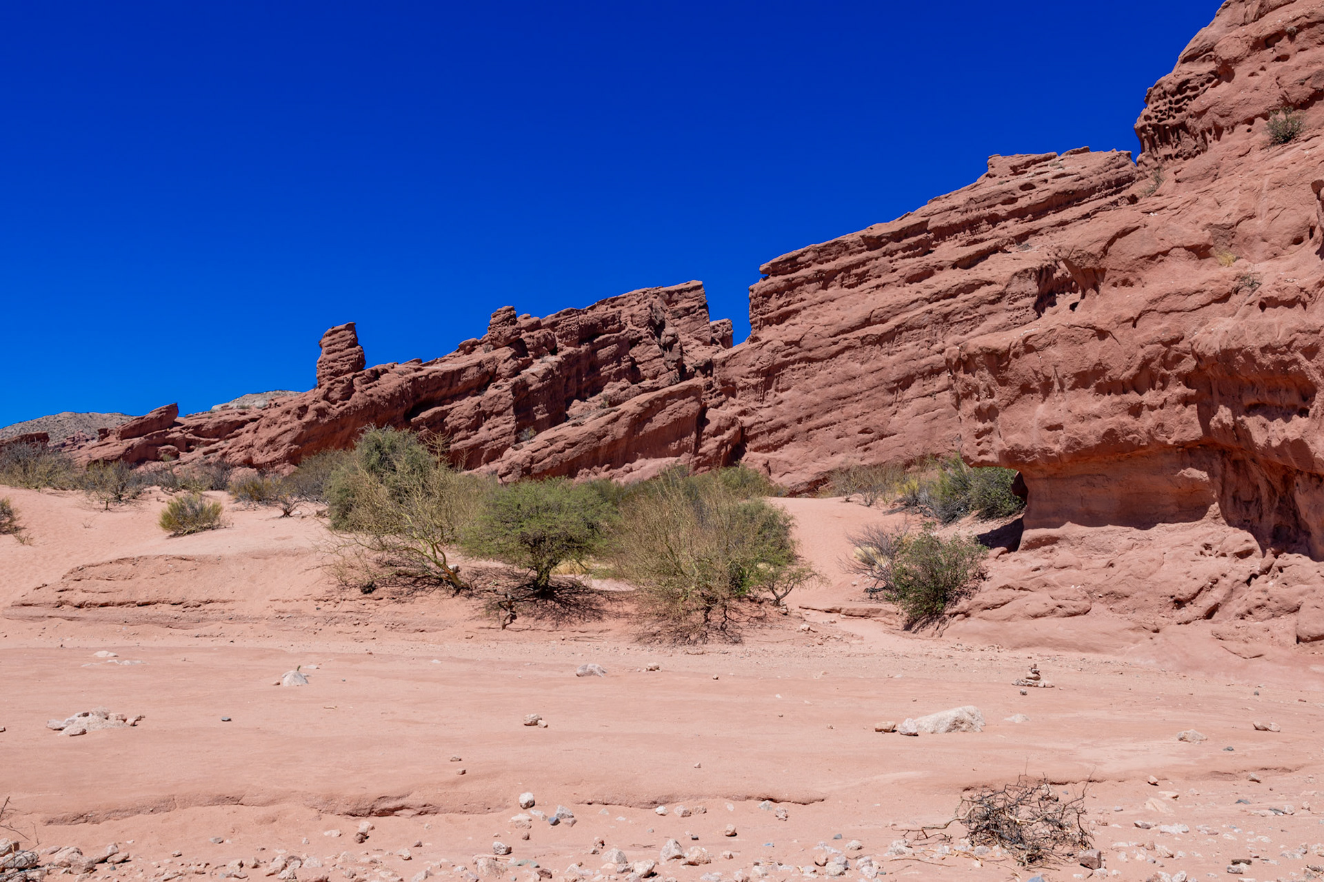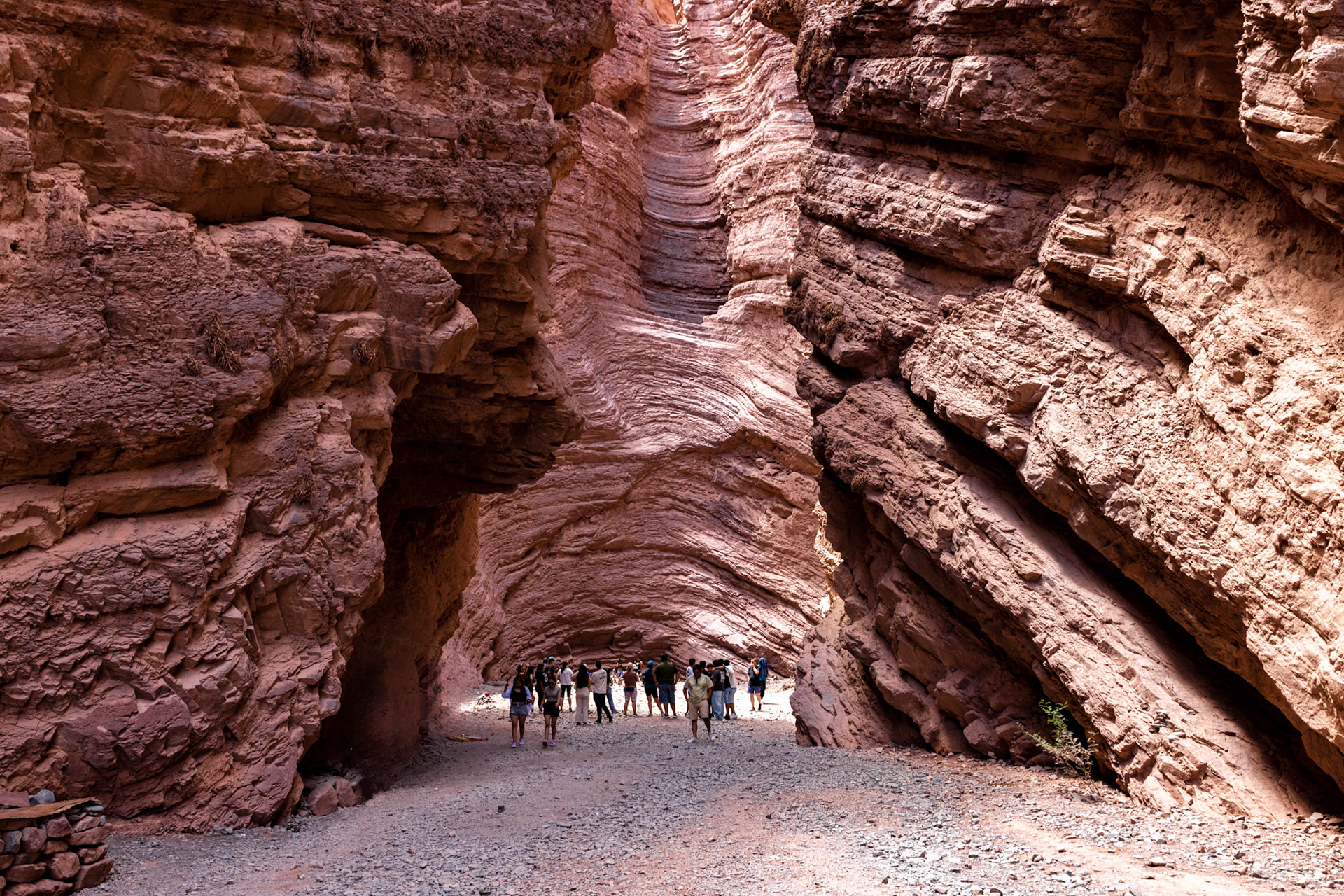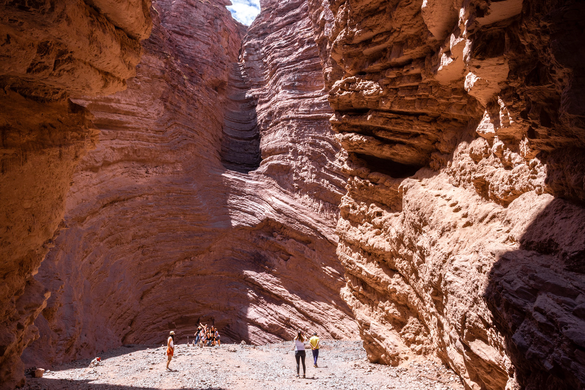 Obwohl wir morgen wieder nach Salta zurückfahren werden, schauen wir uns bereits heute die ersten Kilometer der RN 68 an, die sogenannte Quebrada de las Conchas. Die Quebrada ist eine spektakuläre Schlucht entlang der Nationalstrasse mit bizarren Felsformationen aus rotem Sandstein. Die meisten Formationen haben Namen wie „Garganta del Diablo“ (Teufelsrachen), „El Castillo“ (das Schloss), „El Obelisco“ oder „Anfiteatro“. Wir machen verschiedene Fotostops und kurze Spaziergänge, wobei der interessanteste Halt derjenige beim Anfiteatro ist. Das Anfiteatro ist ein 70 m hoher und 20 m breiter Kessel. Die Akustik hier soll umwerfend sein und so finden während des Südwinters im Juli regelmässig Konzerte statt. Bei unserem Besuch geht es allerdings weniger romantisch zu und her. Anfangs haben wir Glück und wir können den magischen Ort kurze Zeit geniessen, dann aber fallen zwei Schulklassen und mehrere Touristengruppen über das Anfiteatro her und wir machen uns wieder auf den Heimweg, um uns bei ein paar Empanadas und einem Glas Weisswein ein bisschen auszuruhen – irgendwie haben wir immer noch die gestrige „Scheiaweia-Nacht“ in den Knochen.