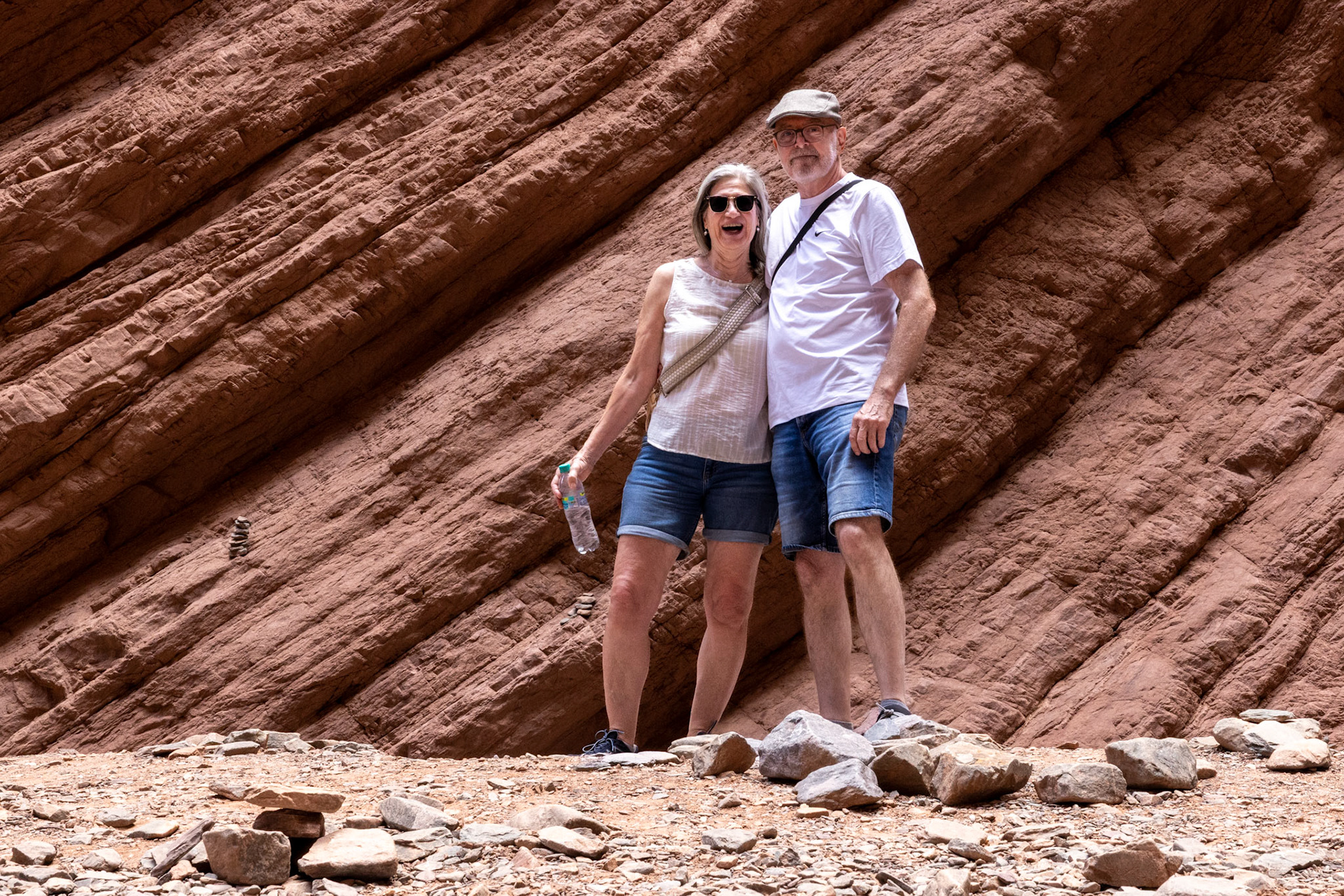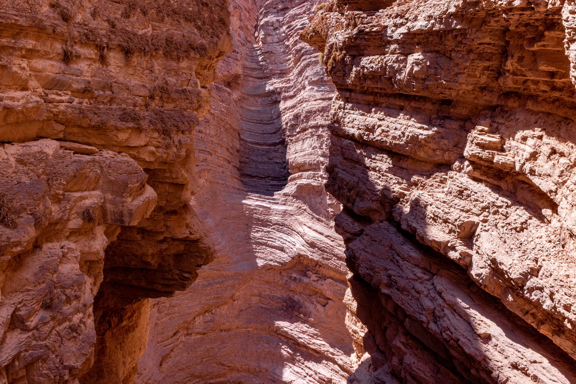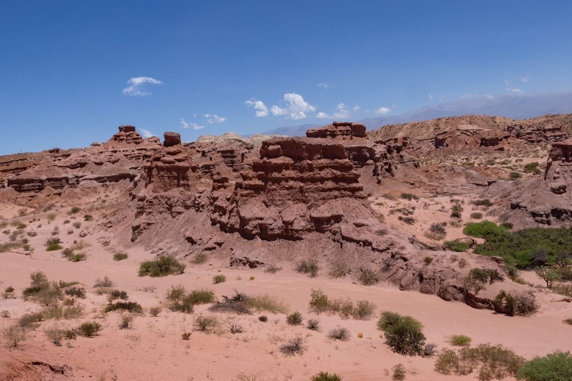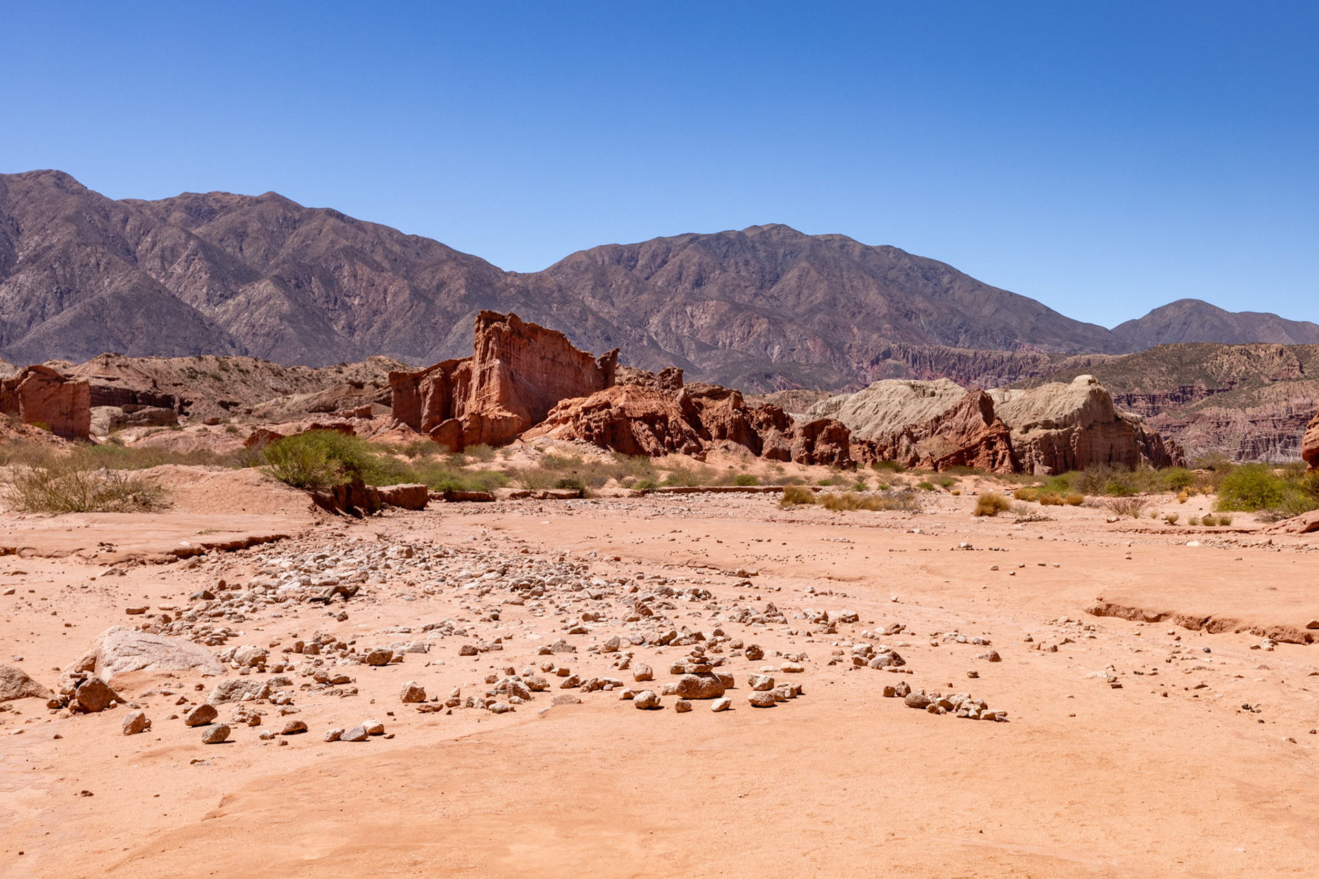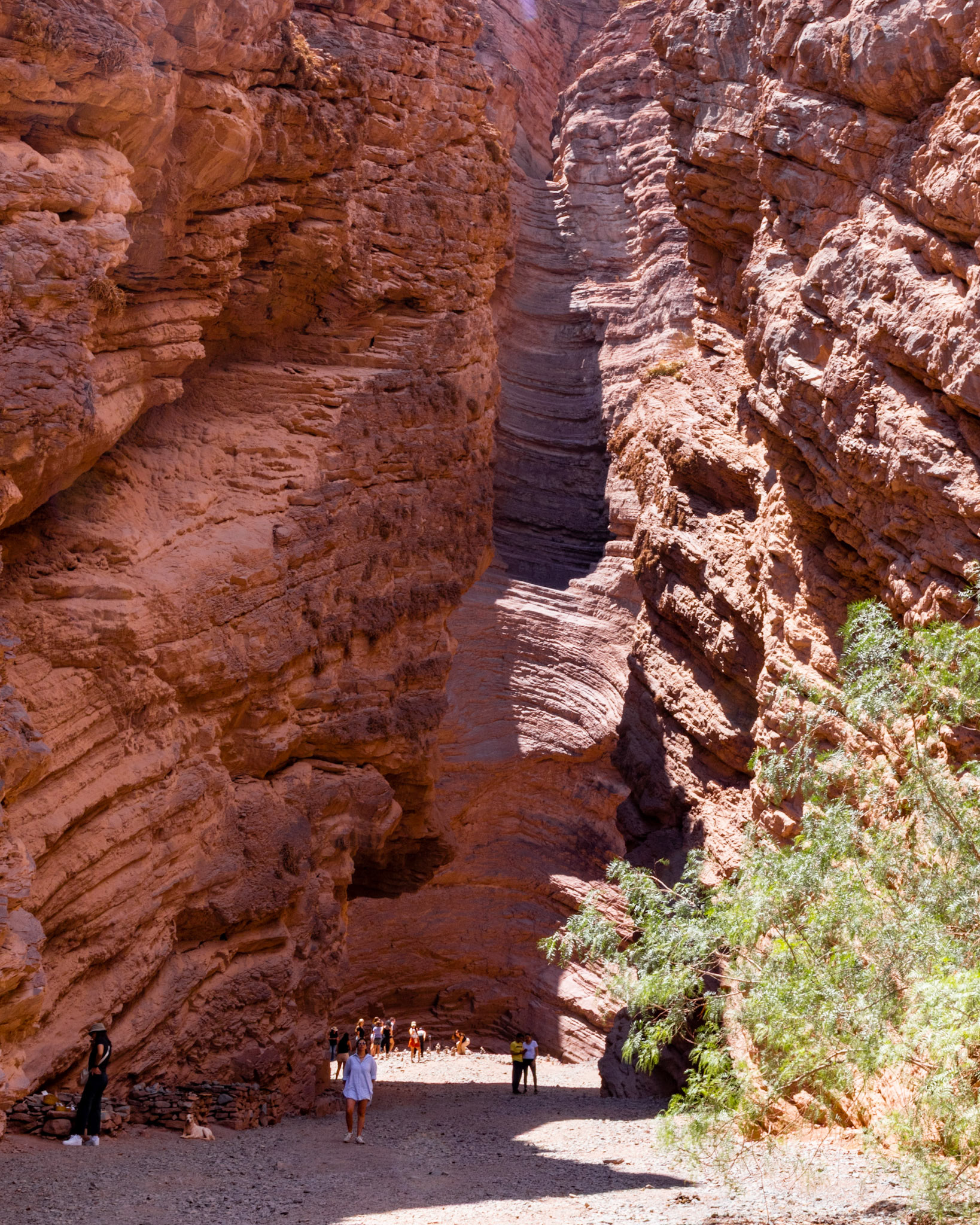 Obwohl wir morgen wieder nach Salta zurückfahren werden, schauen wir uns bereits heute die ersten Kilometer der RN 68 an, die sogenannte Quebrada de las Conchas. Die Quebrada ist eine spektakuläre Schlucht entlang der Nationalstrasse mit bizarren Felsformationen aus rotem Sandstein. Die meisten Formationen haben Namen wie „Garganta del Diablo“ (Teufelsrachen), „El Castillo“ (das Schloss), „El Obelisco“ oder „Anfiteatro“. Wir machen verschiedene Fotostops und kurze Spaziergänge, wobei der interessanteste Halt derjenige beim Anfiteatro ist. Das Anfiteatro ist ein 70 m hoher und 20 m breiter Kessel. Die Akustik hier soll umwerfend sein und so finden während des Südwinters im Juli regelmässig Konzerte statt. Bei unserem Besuch geht es allerdings weniger romantisch zu und her. Anfangs haben wir Glück und wir können den magischen Ort kurze Zeit geniessen, dann aber fallen zwei Schulklassen und mehrere Touristengruppen über das Anfiteatro her und wir machen uns wieder auf den Heimweg, um uns bei ein paar Empanadas und einem Glas Weisswein ein bisschen auszuruhen – irgendwie haben wir immer noch die gestrige „Scheiaweia-Nacht“ in den Knochen.