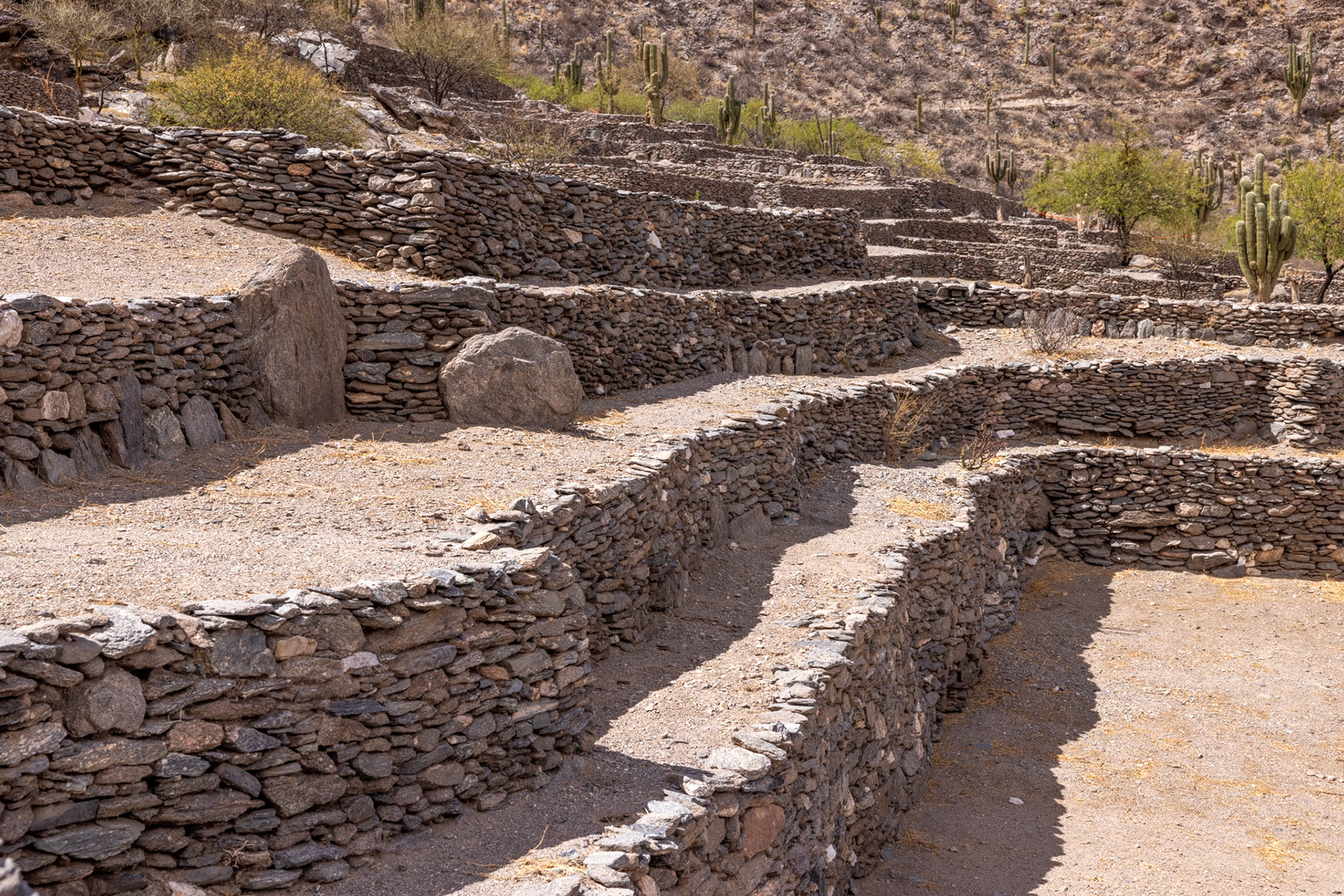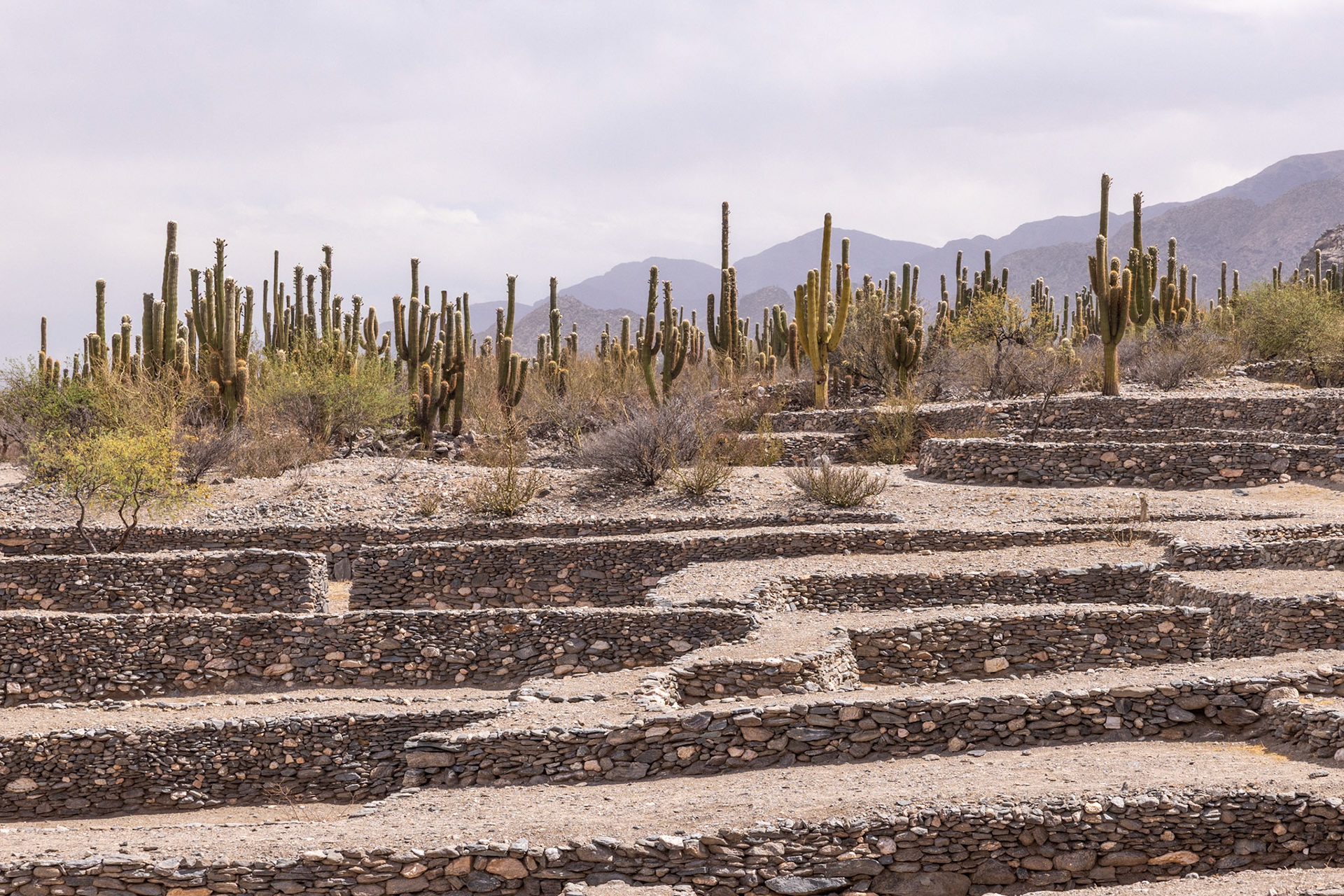 Die zweite Station des heutigen Ausfluges ist die Ciudad Sagrada de Quilmes. Eine der bedeutendsten präkolumbianischen Ruinestätten des Landes. Hier lebte einst das Volk der Quilmes, eine der indigenen Gemeinschaften des Valle Calchaquíes. Sie errichteten hier zwischen dem 10. und 17. Jahrhundert eine befestigte Stadt mit Wohnanlagen und Verteidigungsanlagen für rund 5 000 Einwohner. Jahrhundertelang leisteten die Quilmes Widerstand gegen die Inka. Bis im 17. Jh. Die spanischen Eroberer kamen, und ganze Arbeit leisteten. 1667 gelang es den Spaniern, das Volk der Quilmes zu besiegen und auf brutale Weise zu demütigen. Die Überlebenden des Kampfes zwang man, über 1000 Kilometer nach Buenos Aires zu marschieren. Von den 2600 Quilmes überlebten gerade mal 600. Die Grossstadt in der Nähe von Buenos Aires trägt noch immer den Namen des vertriebenen Volkes der Quilmes.