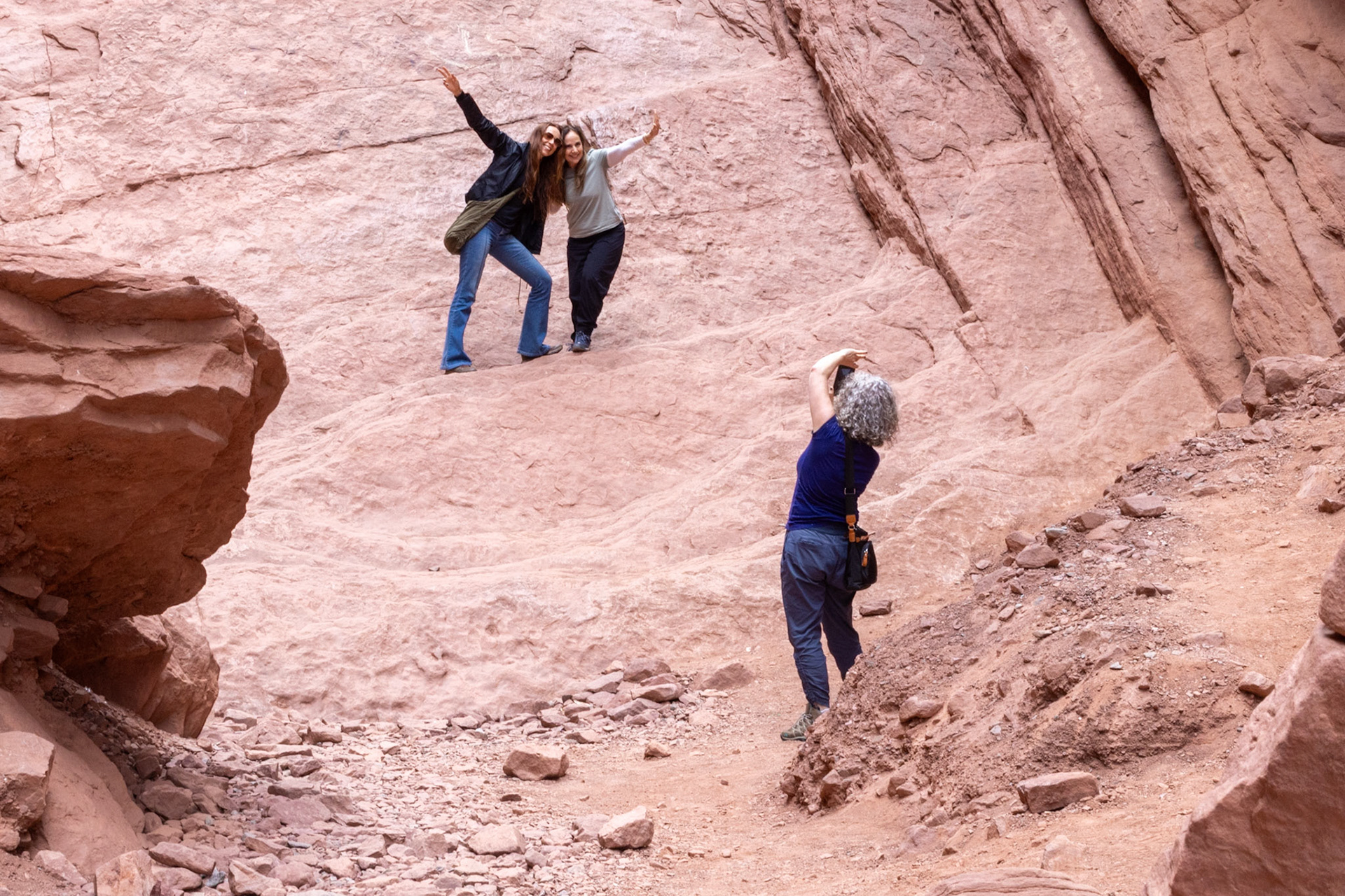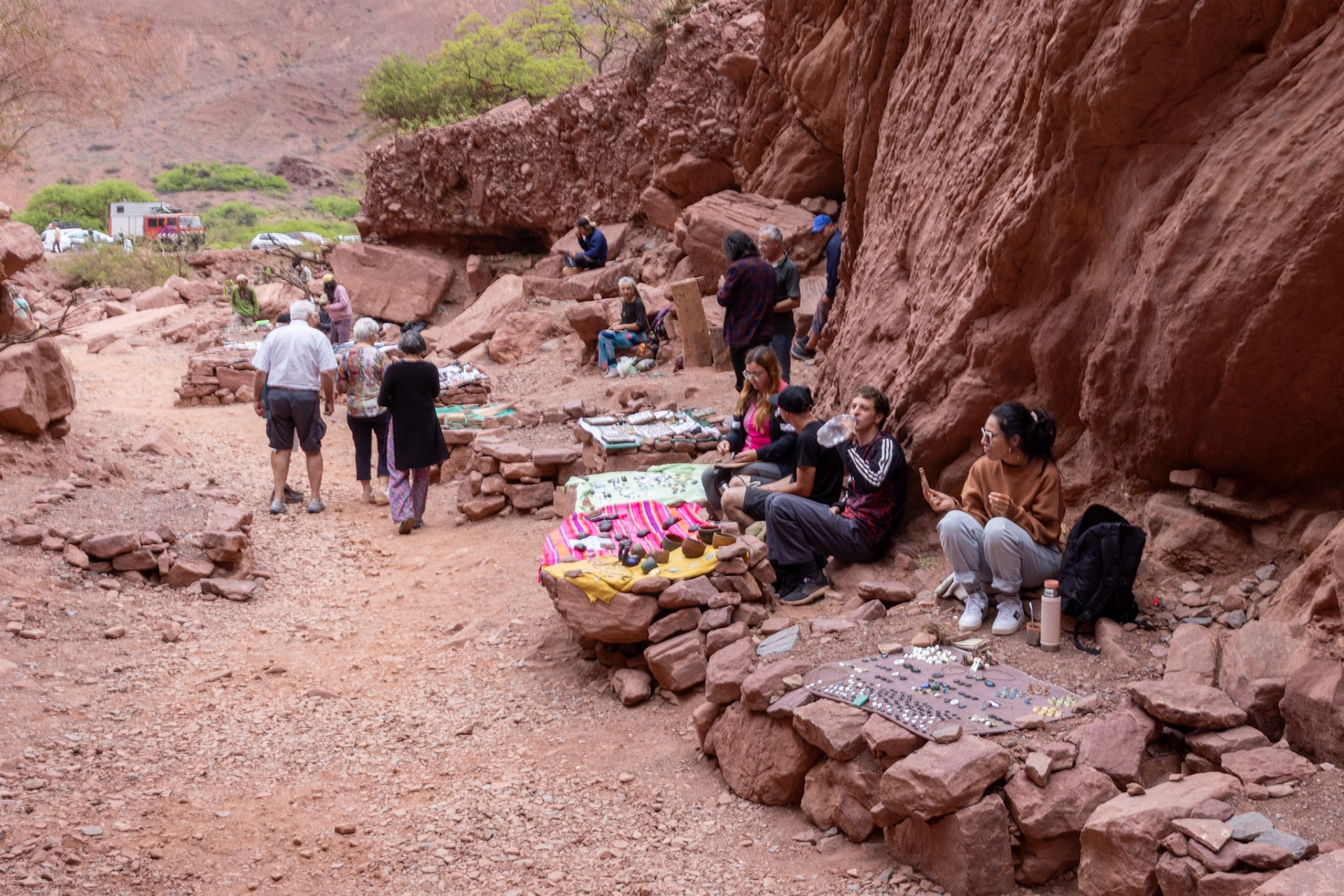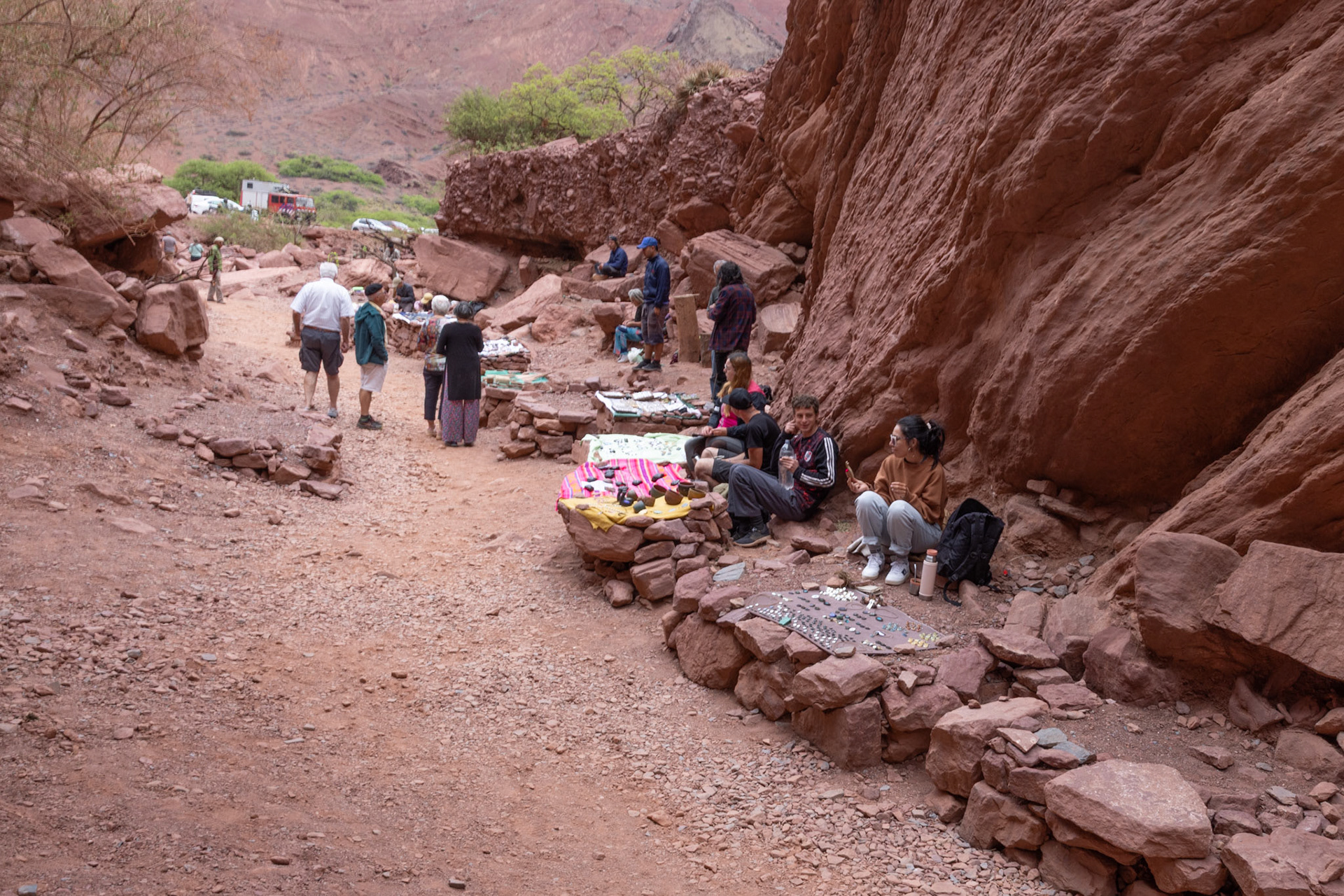 Und nun zum heutigen Tag: Wir fahren wieder die Quebrada de las Conchas in Richtung Norden hoch. Auch dieses Mal machen wir einige Fotohalte. Bei dem „Garganta del Diablo“ (Rachen des Teufels) wundern wir uns einmal mehr über die „Selfietouristen“ aber auch über die vielen Aussteigertypen mit lustigen Rastafrisuren, welche am Eingang zu diesem Naturdenkmal versuchen, ihren selbstgebastelten Karsumpel an den Mann und an die Frau zu bringen.