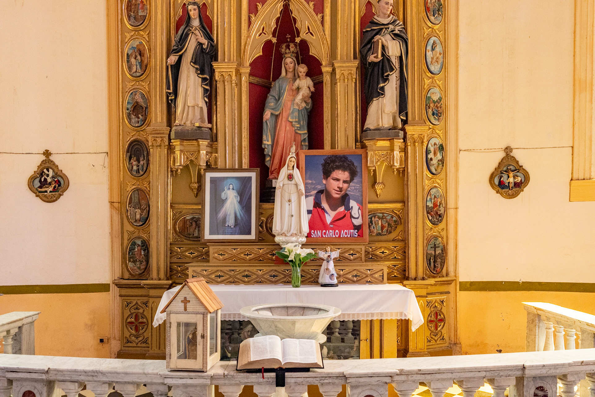 Wir spazieren über den grossen Dorfplatz, welcher auf drei Seiten umrahmt ist von Restaurants. Auf der Südseite des Platzes thront die Catedral de Nuestra Señora del Rosario, die ungewöhnliche fünfschiffige Hautpkirche der Stadt. Erbaut wurde sie im Jahr 1885. Besonders auffällig ist, dass eine der Seitenkapellen dem Heiligen San Carlo Acutis gewidmet ist, dem italienischen Teenager, welcher im Oktober 2006 mit nur gerade 15 Jahren an Leukämie starb. Acutis war ein religiöser Influencer und wurde im September dieses Jahres vom Papst heiliggesprochen. Obwohl San Carlo Acutis weder zu Argentinien noch zu Cafayate einen Bezug hatte, wird er hier verehrt. Vor zwei Wochen, am Todestag Acutis’, fand in dieser Kirche sogar ein Gedenkgottesdienst statt.