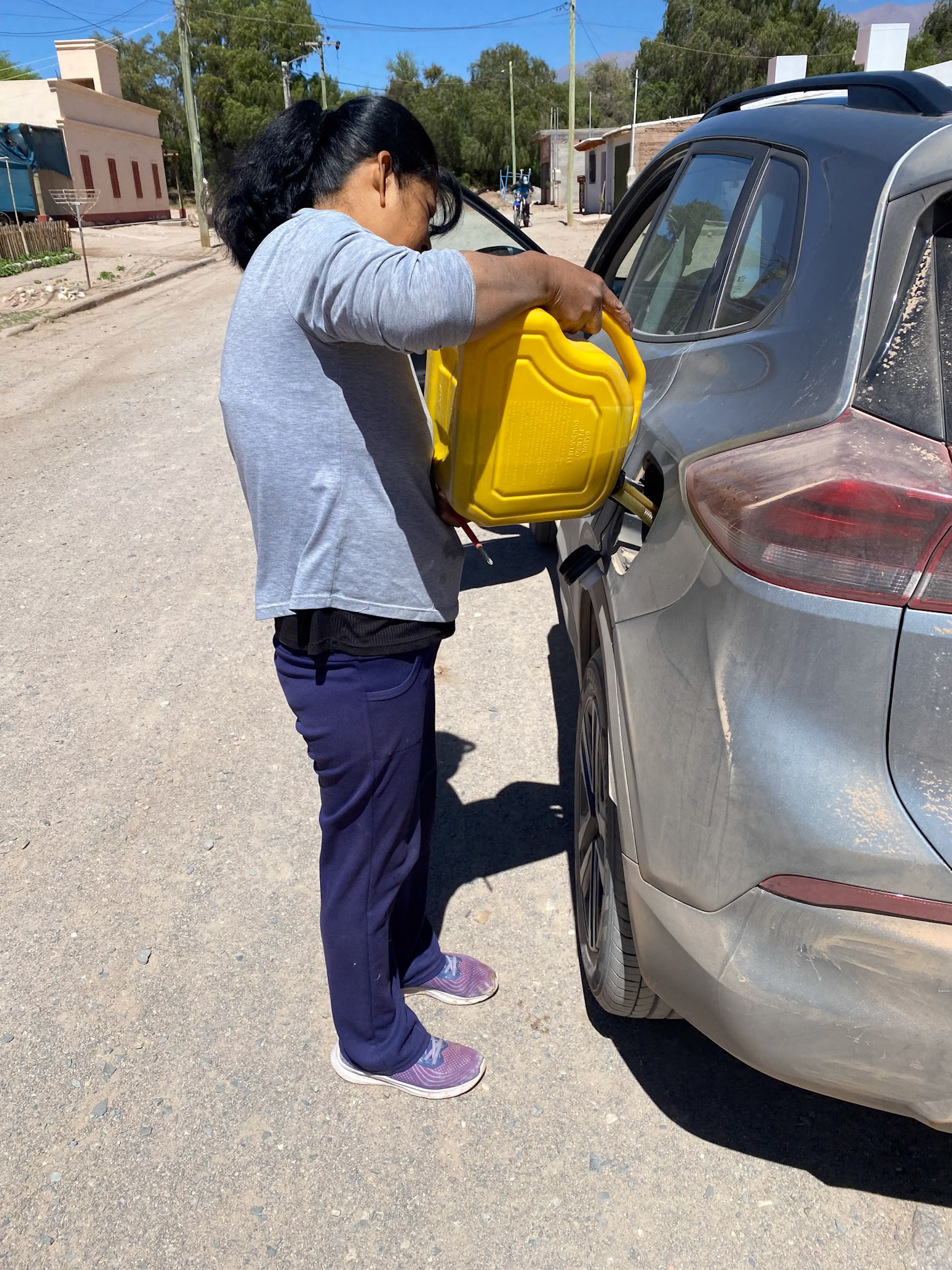 Kurz vor 11 Uhr fahren wir mit dem Auto los. In Molinos wird zuerst aufgetankt. Auch hier gibt es keine Tankstelle und wir kaufen im Dorfladen einen 10 – Liter Kanister, selbstverständlich zu Schwarzmarktpreisen. Danach brauchen wir noch Bargeld, was sich in dem winzigen Dorf ebenfalls als relativ schwierig erweist. Da die beiden einzigen Bankomaten im Moment repariert werden, müssen sie vom Militär bewacht werden. Der erste Versuch scheitert, da offenbar einer der Elektriker das Stromkabel gekappt hat. Nachdem aus dem einen Bankomaten eine Rauchschwade emporsteigt, fassen wir uns ein Herz und versuchen es noch einmal, zum Glück mit Erfolg.