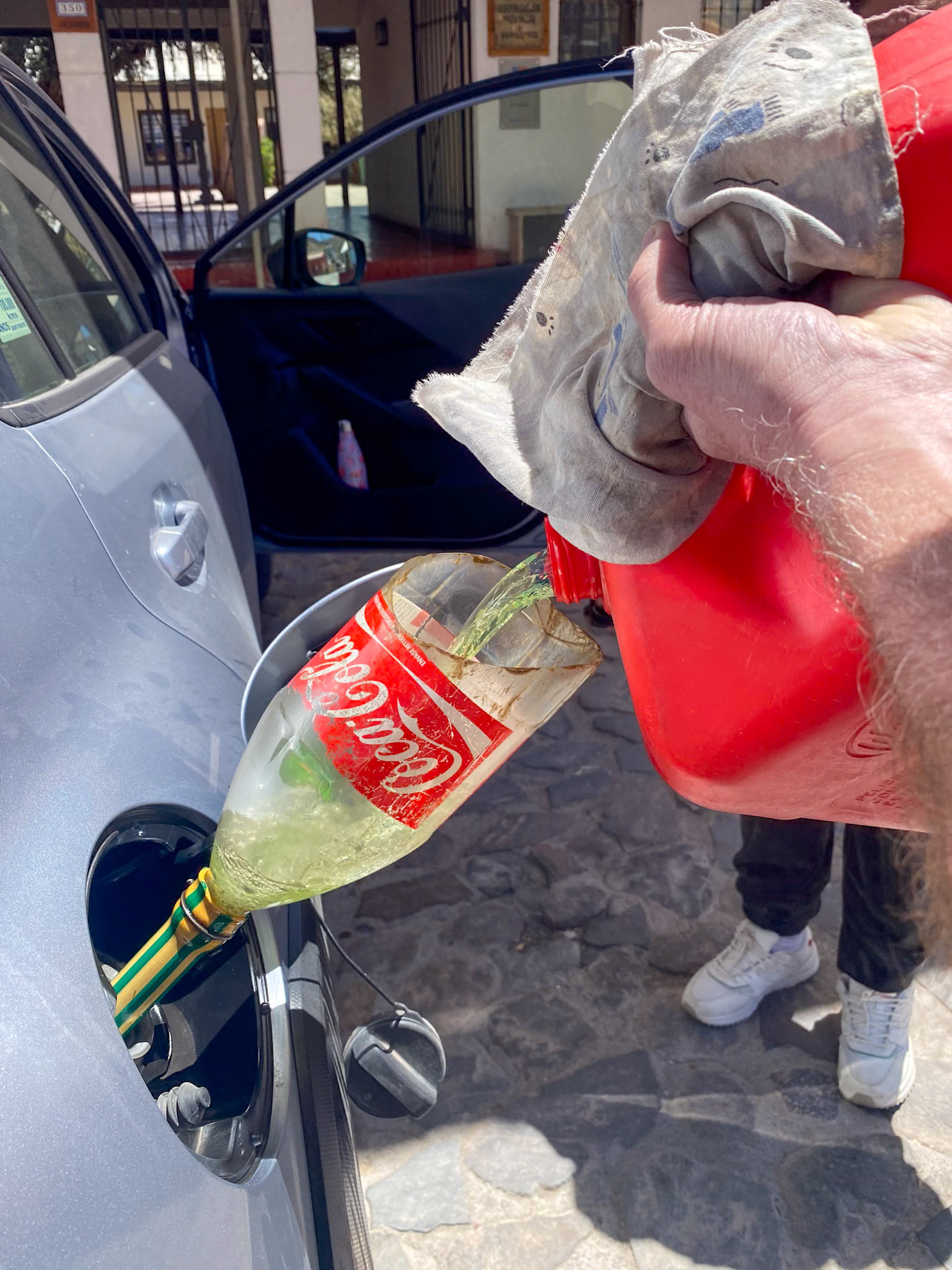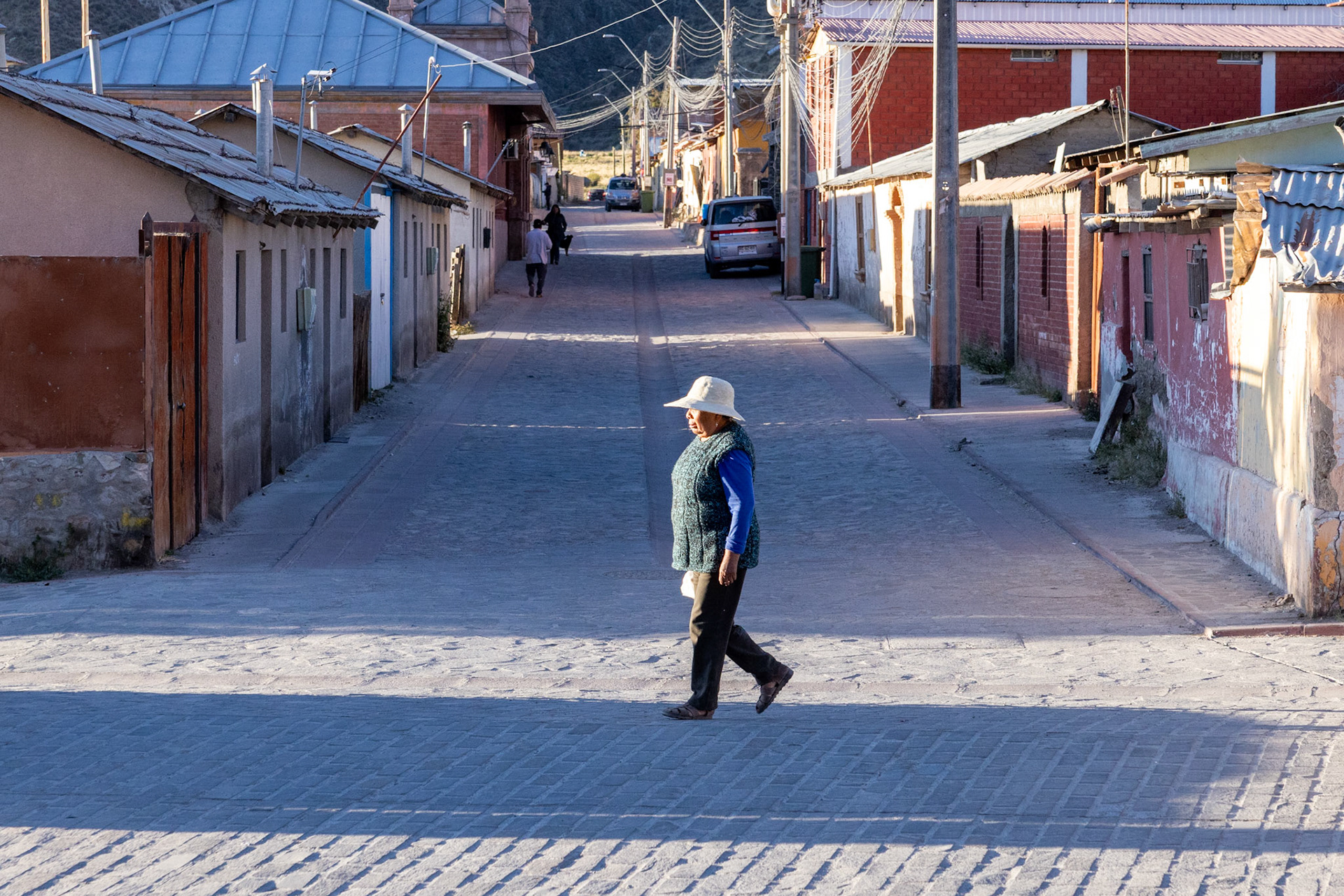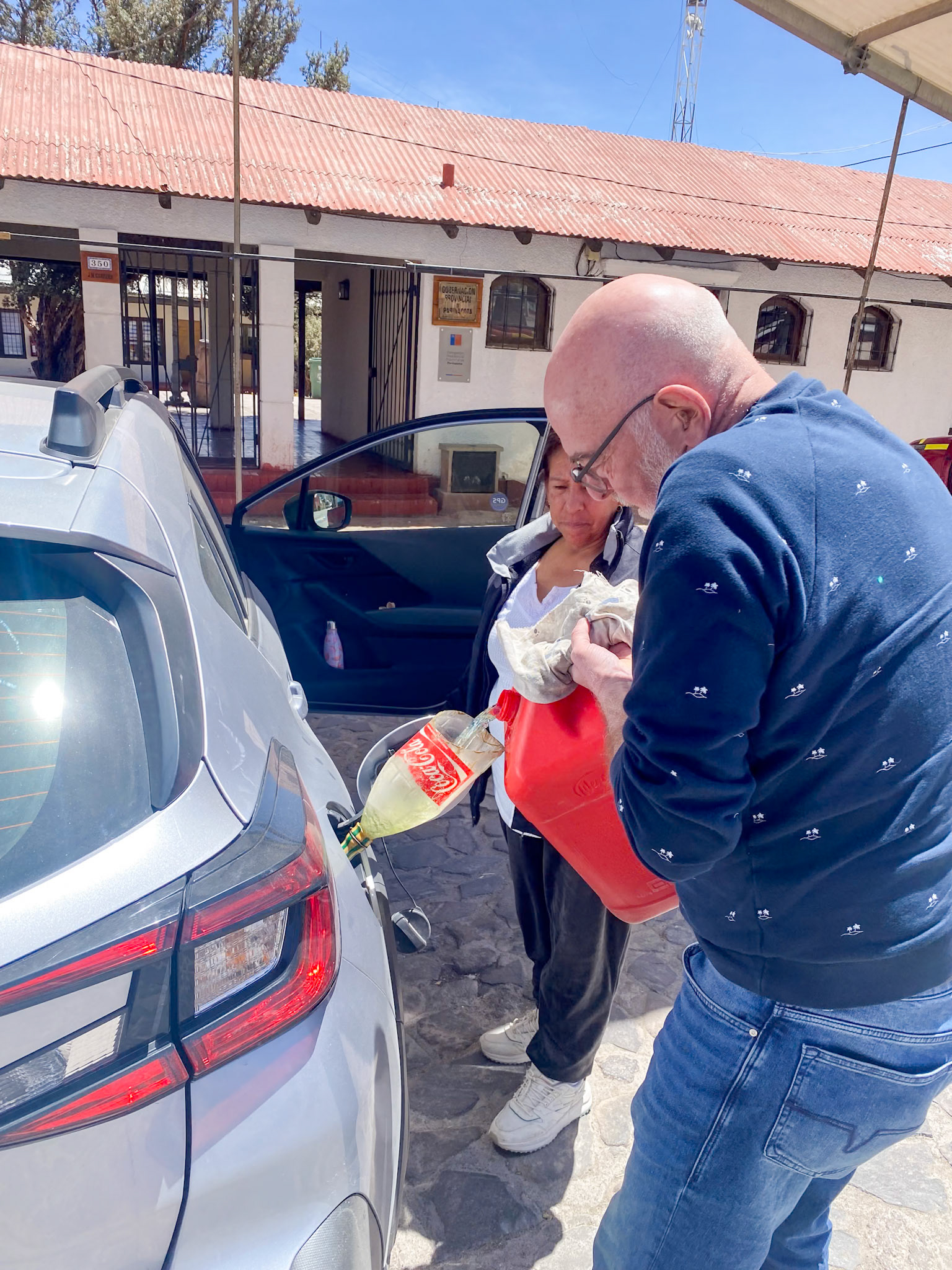 Gegen 15 Uhr kommen wir wieder in Putre an. An erster Stelle steht Tanken auf dem Programm. Da es aber im Umkreis von 200 km keine Tankstelle gibt, ist dies relativ schwierig. Ich spreche ein paar Männer an und erhalte die Auskunft, dass der Minimarkt Benzin verkaufe. Die Dame im Minimarkt verweist mich auf einen Laden etwas weiter unten, der aber geschlossen ist. Schliesslich fahren wir zur Municipalidad, eine Art Gemeindeverwaltung. Ein freundlicher, leicht verschlafener Beamter kommt mit mir vor die Türe und zeigt mir einen kleinen Laden, der traditionelle Kleidung verkauft. Der Laden ist etwa 3m2 gross und total vollgestopft mit Textilien. Hinter dem Tresen sitzt eine ältere Dame. Mir kommen Zweifel auf, aber tatsächlich, die Dame fragt mich, wieviele Bidons ich brauche. Aus dem Hinterhof schleppt sie einen roten Plastikkanister und einen selbstgebastelten Trichter an. Und so ist unsere Exkursion von morgen und die Weiterreise am Donnerstag gesichert.