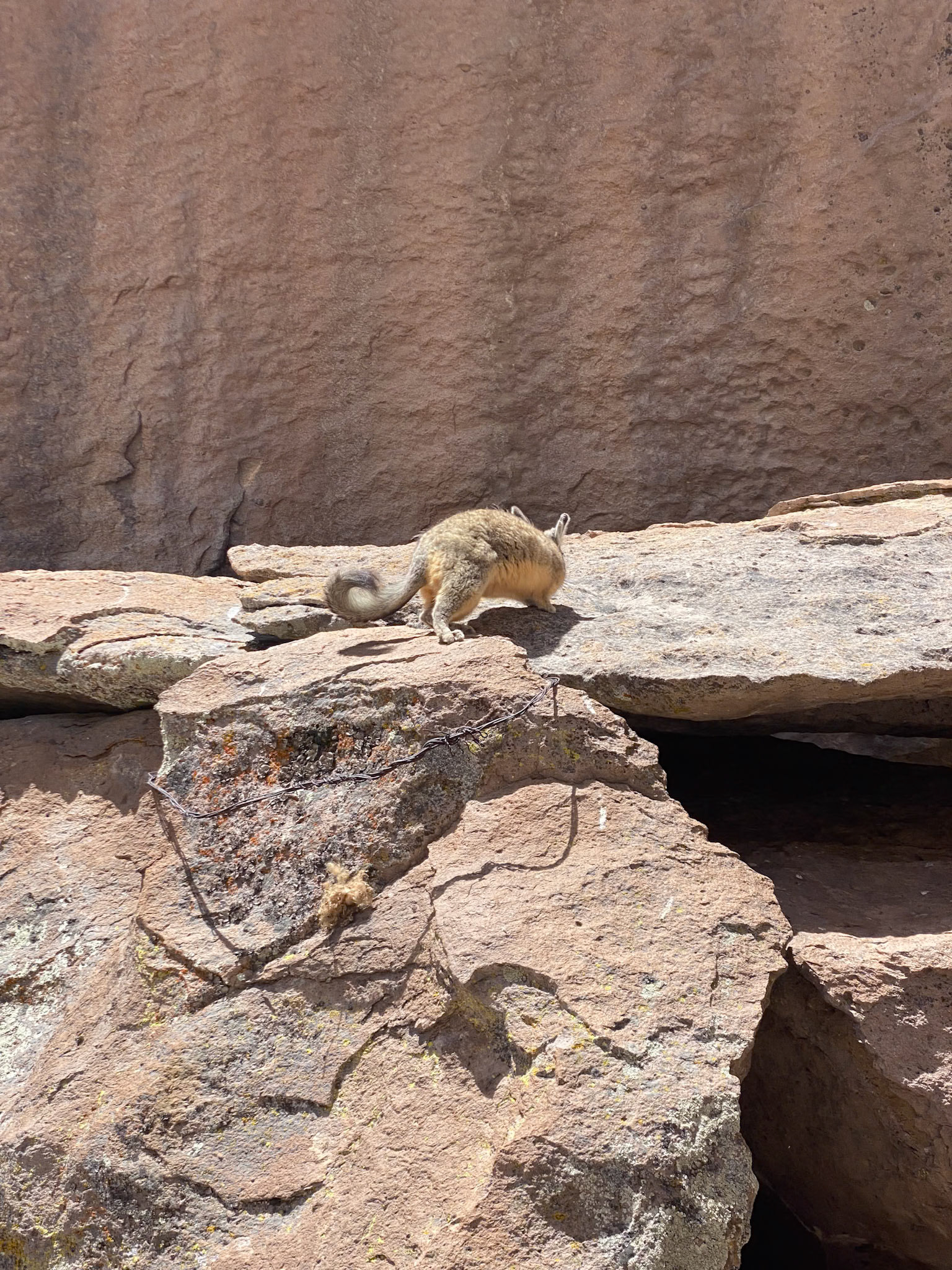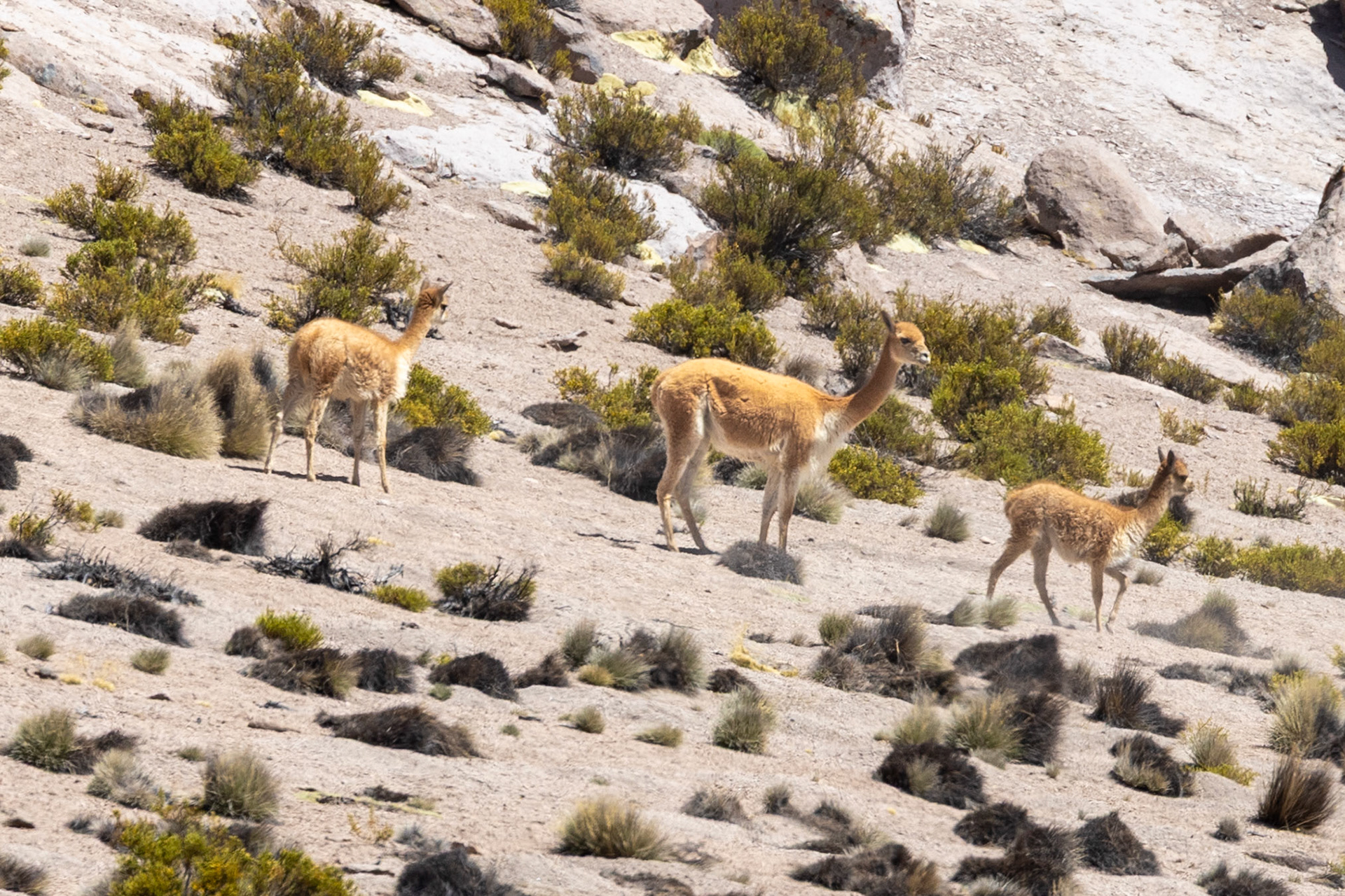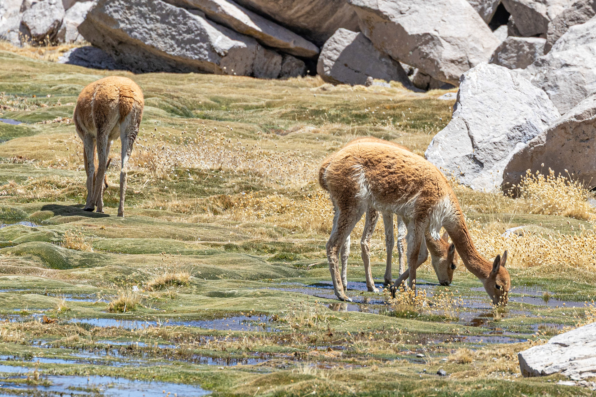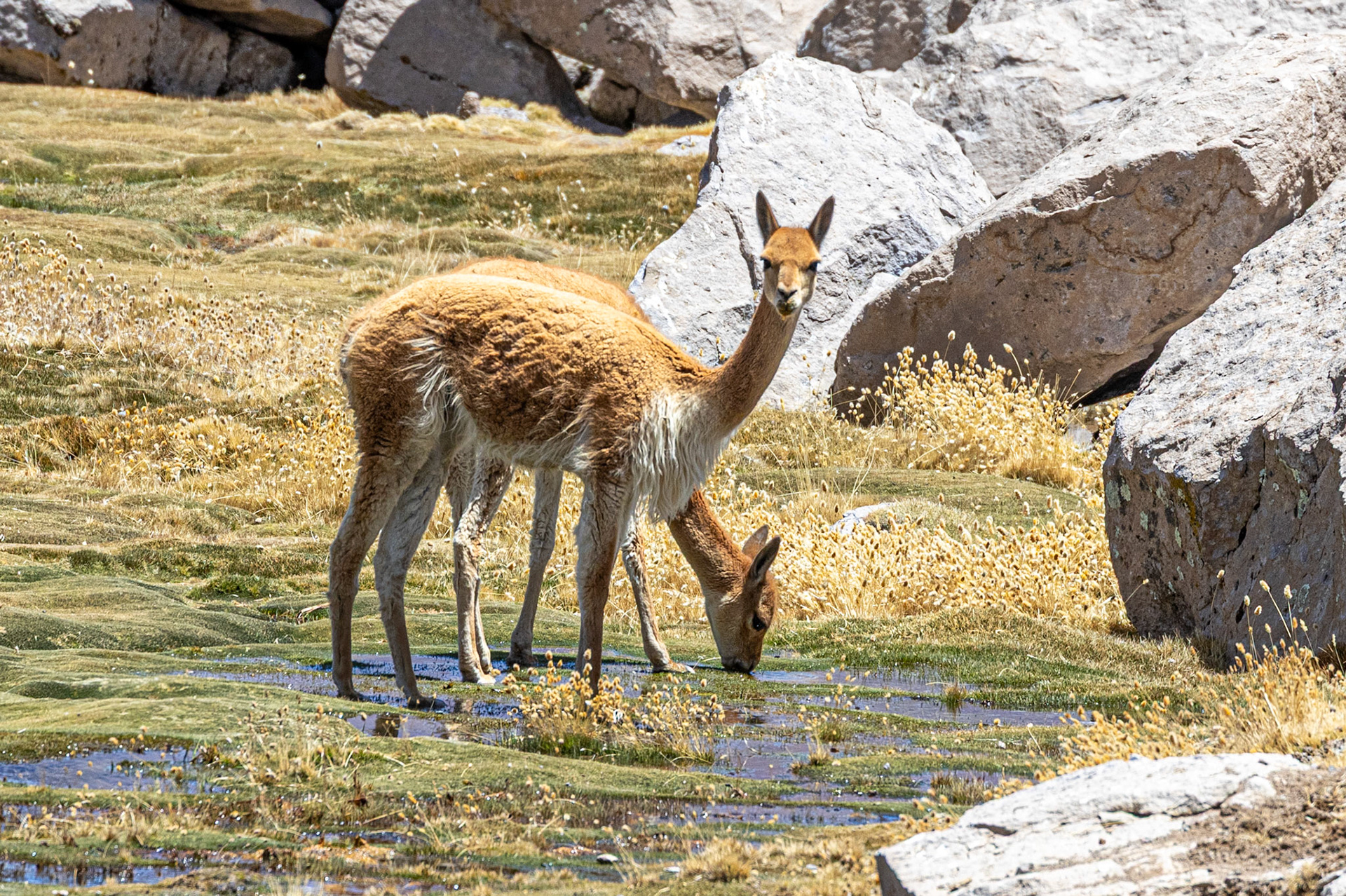 Wir lassen den Tag langsam angehen. Die Höhe macht uns immer noch zu schaffen. Wir fragen den Kellner im Hotel, ob er Touren empfehlen könne, welche unterhalb der 3500 m lägen. Da aber die Strasse nach Socoroma wegen Bauarbeiten teilweise bis zu zwei Stunden gesperrt ist, verneint er. Wir beschliessen trotz Allem, die Strasse nach oben bis auf den Altiplano zu nehmen. Es gibt dort ein Feuchtgebiet mit einem kleinen Thermalbad. Da dieses nur aus einer kleinen, dunklen Hütte besteht, machen wir uns auf den empfohlenen Rundweg von ca. 1 km. Auf einer Höhe von 4500 m eine ziemlich anstrengende Angelegenheit. Unsere Mühe wird jedoch belohnt. Die Landschaft ist umwerfend und wir können verschiedene Tiere beobachten. Am gegenüberliegenden Hang kommt uns eine Herde Vicunyas entgegen. Etwas weiter entdecken wir zwei Viscachas (Chinchillas), die in einer Felsnische schlafen und in einem der Tümpel ist eine Gruppe Enten am Baden.