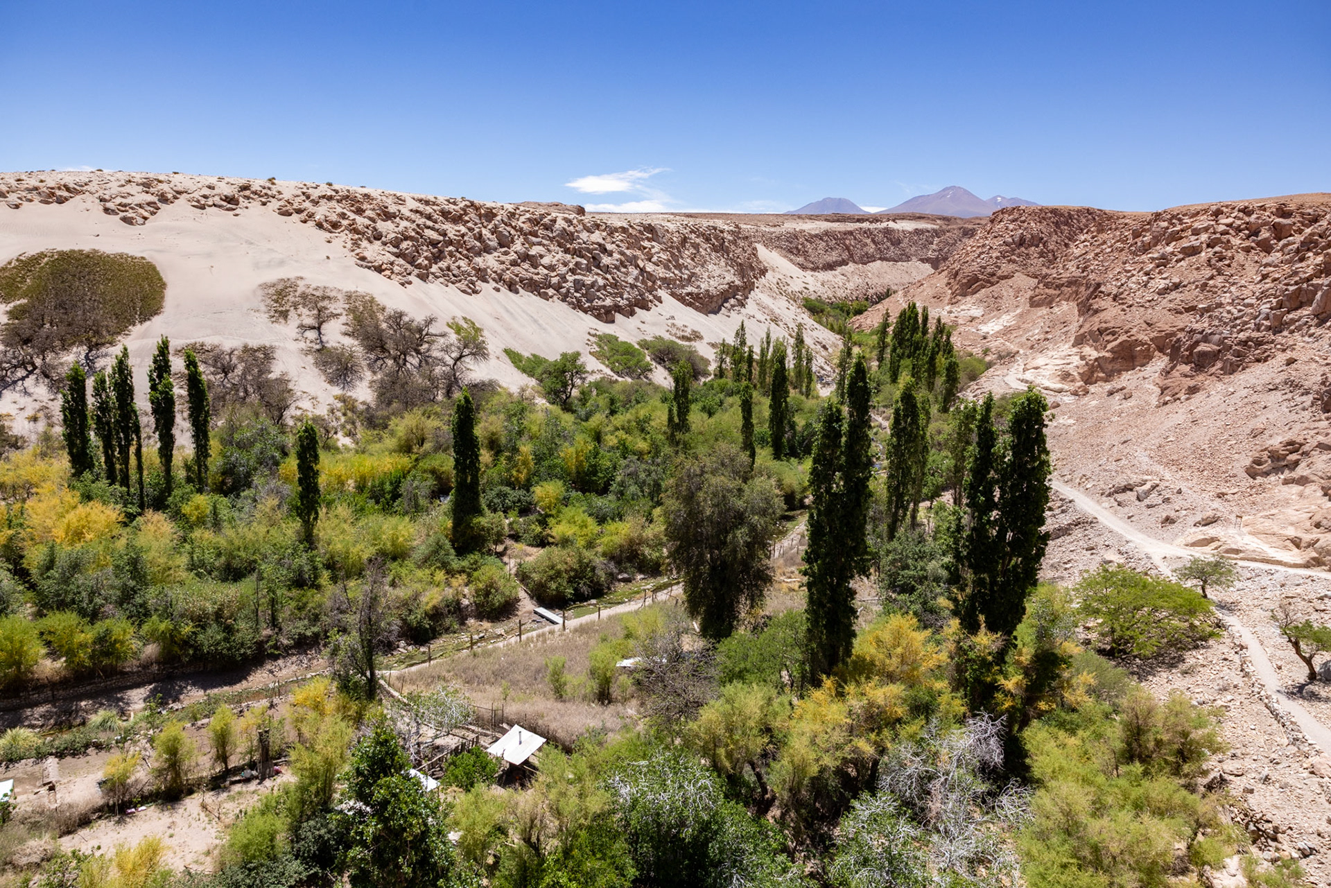 Wir nehmen heute den längsten Abschnitt unserer Reise in Angriff. Für die knapp 500 km von Iquique nach San Pedro de Atacama brauchen wir fast sechs Stunden. Die Strecke ist eher langweilig - 80km geradeaus, leichte Rechtskurve, 95km geradeaus, leichte Linkskurve usw. Das einzig Spannende ist die Zollstation bei Quillagua. Wohlverstanden befindet sich dieser Zoll nicht an der argentinischen Grenze, sondern mitten in Chile, wo niemand eine Grenzkontrolle erwarten würde. Einmal mehr erstaunt uns die südamerikanische Bürokratie. Beim ersten Durchgang bemerken wir nicht, dass wir einen Durchfahrschein hätten lösen sollen und müssen mit dem Auto nochmals hinten anstehen. Beim zweiten Versuch klappt es bestens. Ich muss mit den Pässen und den Fahrzeugpapieren anstehen. Der nette Beamte am Schalter tippt gemächlich die Passnummern und das Nummernschild ein und druckt mir den Durchfahrschein aus, mit welchem wir dann endlich die Erlaubnis für die Weiterfahrt erhalten.