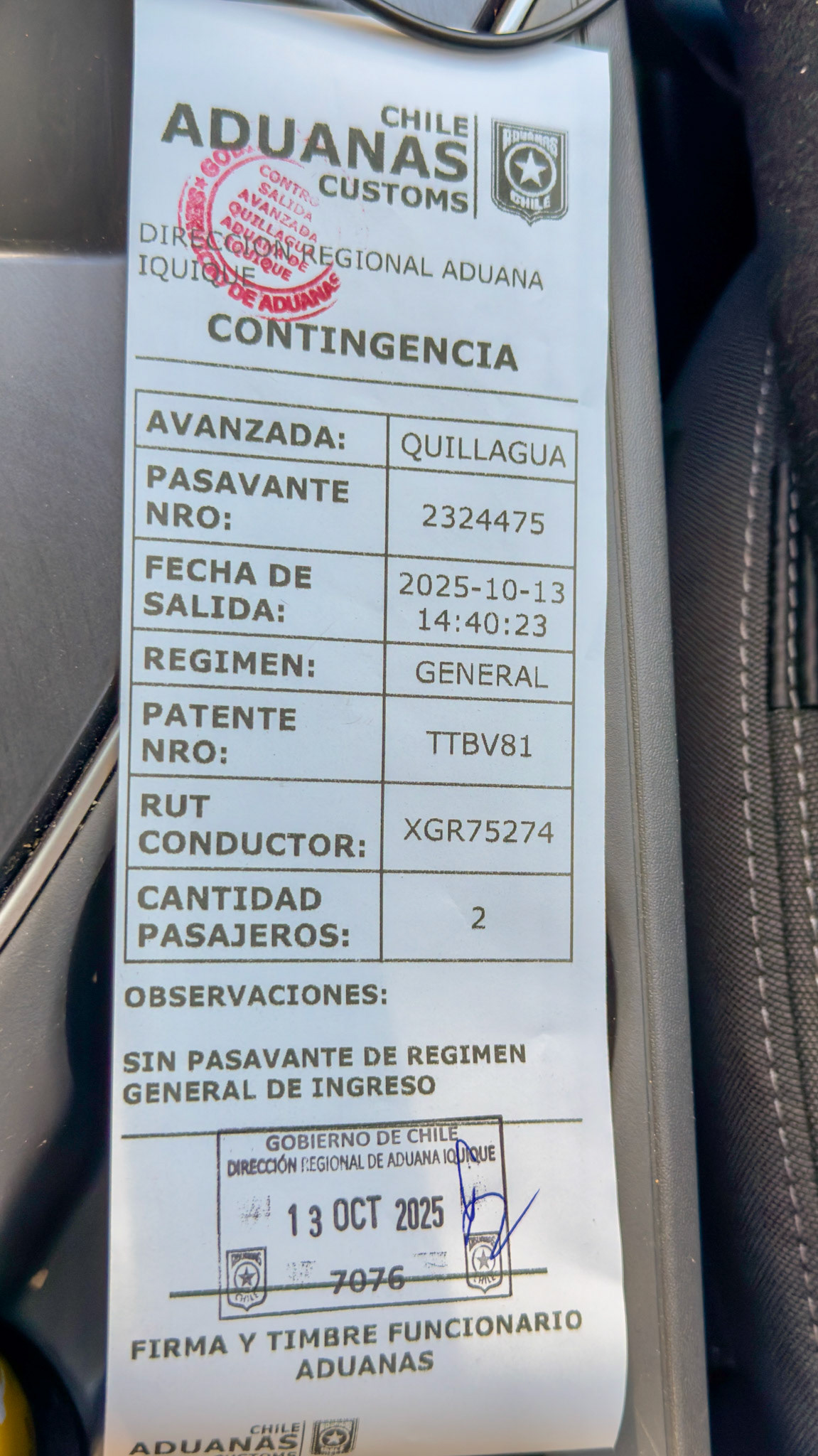 Wir nehmen heute den längsten Abschnitt unserer Reise in Angriff. Für die knapp 500 km von Iquique nach San Pedro de Atacama brauchen wir fast sechs Stunden. Die Strecke ist eher langweilig - 80km geradeaus, leichte Rechtskurve, 95km geradeaus, leichte Linkskurve usw. Das einzig Spannende ist die Zollstation bei Quillagua. Wohlverstanden befindet sich dieser Zoll nicht an der argentinischen Grenze, sondern mitten in Chile, wo niemand eine Grenzkontrollen erwarten würde. Einmal mehr erstaunt uns die südamerikanische Bürokratie. Beim ersten Durchgang bemerken wir nicht, dass wir einen Durchfahrschein hätten lösen sollen und müssen mit dem Auto nochmals hinten anstehen. Beim zweiten Versuch klappt es bestens. Ich muss mit den Pässen und den Fahrzeugpapieren anstehen. Der nette Beamte am Schalter tippt gemächlich die Passnummern und das Nummernschild ein und druckt mir den Durchfahrschein aus, mit welchem wir dann endlich die Erlaubnis für die Weiterfahrt erhalten.